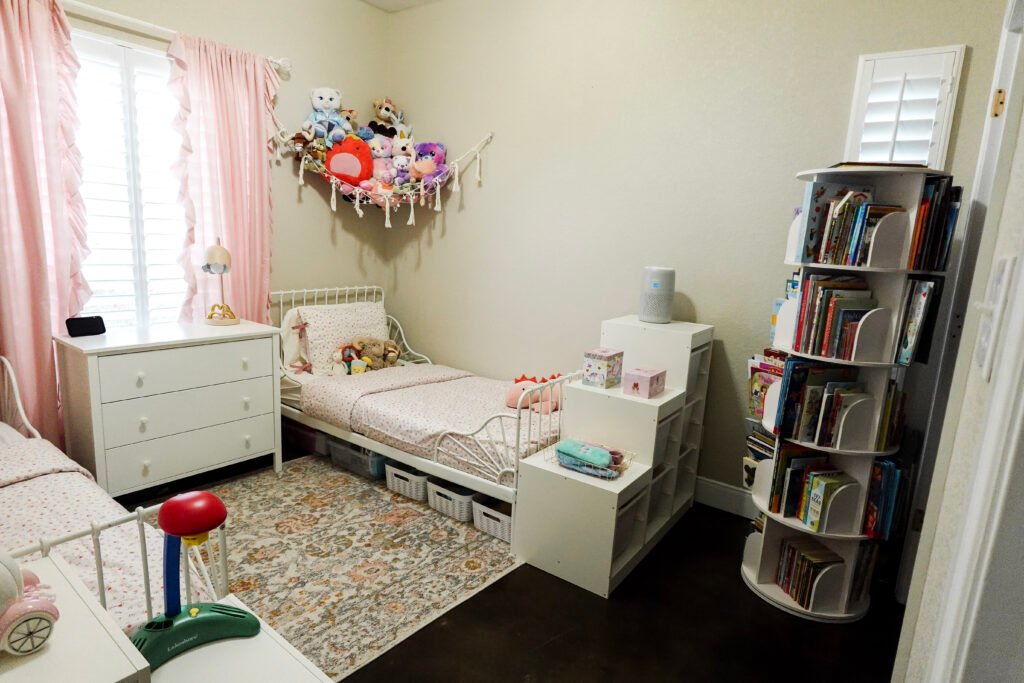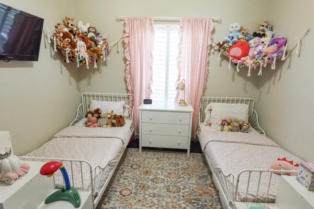 So here is the real version. A 10×10 shared bedroom for two girls, ages seven and six, with real toys and real storage solutions and real chaos that gets reset every single day whether anyone is in the mood or not.