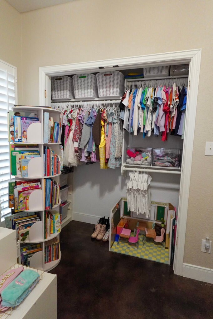 Two twin beds from IKEA, recently upgraded from toddler beds, which was its own project and a whole separate story. A three-drawer dresser that fits exactly between the two beds. A rotating 360-degree bookshelf from Amazon that holds more books than you would think possible. A closet. And a 10×10 footprint that requires every single inch to be intentional.