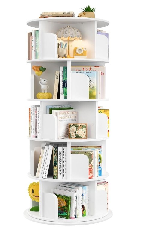 The rotating 360-degree bookshelf from Amazon is one of my favorite finds for this room. It spins, it holds a genuinely surprising number of books across five shelves on each side, and it takes up a single footprint on the floor. If you have a reader or two and you are trying to figure out how to store books without eating up wall space — find this shelf. It is worth every penny.