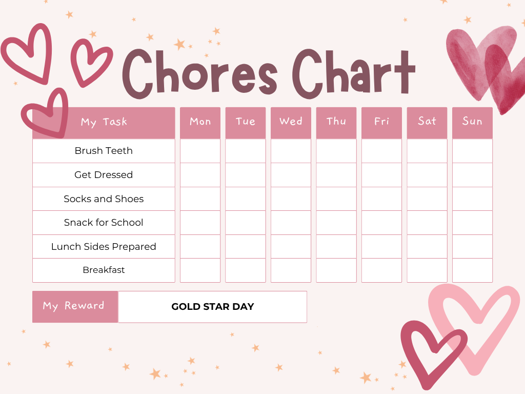 Every completed chore chart earns a gold star. Gold stars go on a chart we keep on the fridge. At 30 gold stars we do something special, it is their choice – Kids Empire, Peter Piper Pizza, trampoline parks, something fun. They work toward it and they feel it when they get there.